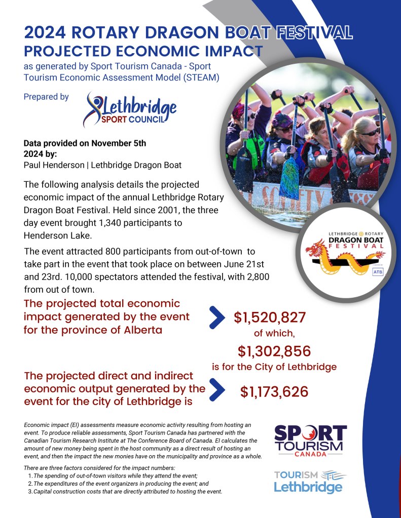 The following analysis details the projected economic impact of the annual Lethbridge Rotary Dragon Boat Festival. Held since 2001, the three day event brought 1,340 participants to Henderson Lake.
